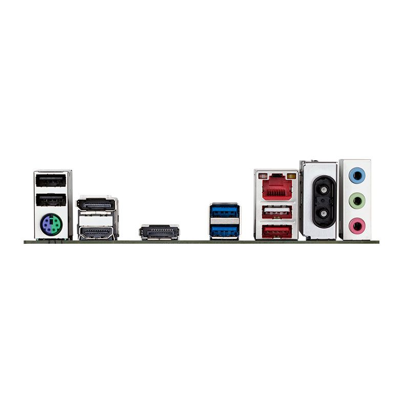 | Painel Traseiro: | 1 x Porta PS/2 para teclado/mouse 1 x Porta HDMI (Nota) 2 x DisplayPorts (Nota) 1 x Porta USB 3.2 Gen 2 Tipo A (vermelha) 2 x Portas USB 3.2 Gen 1 3 x Portas USB 2.0/1.1 2 x Conectores de antena (2T2R) 1 x Porta RJ-45 3 x Conectores de áudio (Nota) O suporte real pode variar de acordo com a CPU. |