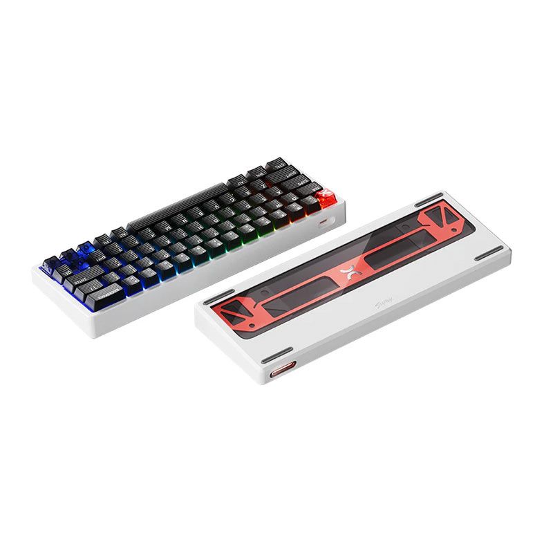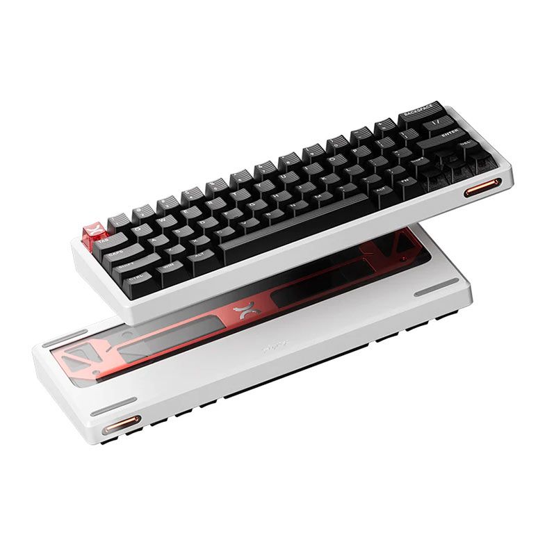O teclado conta com um design estrutural inspirado em chassis de carros de Fórmula 1, trazendo uma construção leve, robusta e visualmente impactante. O conceito de suporte suspenso aliado ao acabamento com vidro óptico transparente cria uma estética moderna e tecnológica.